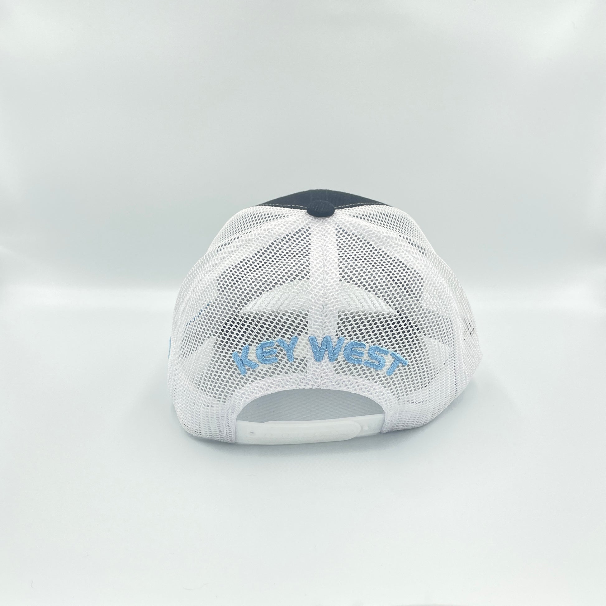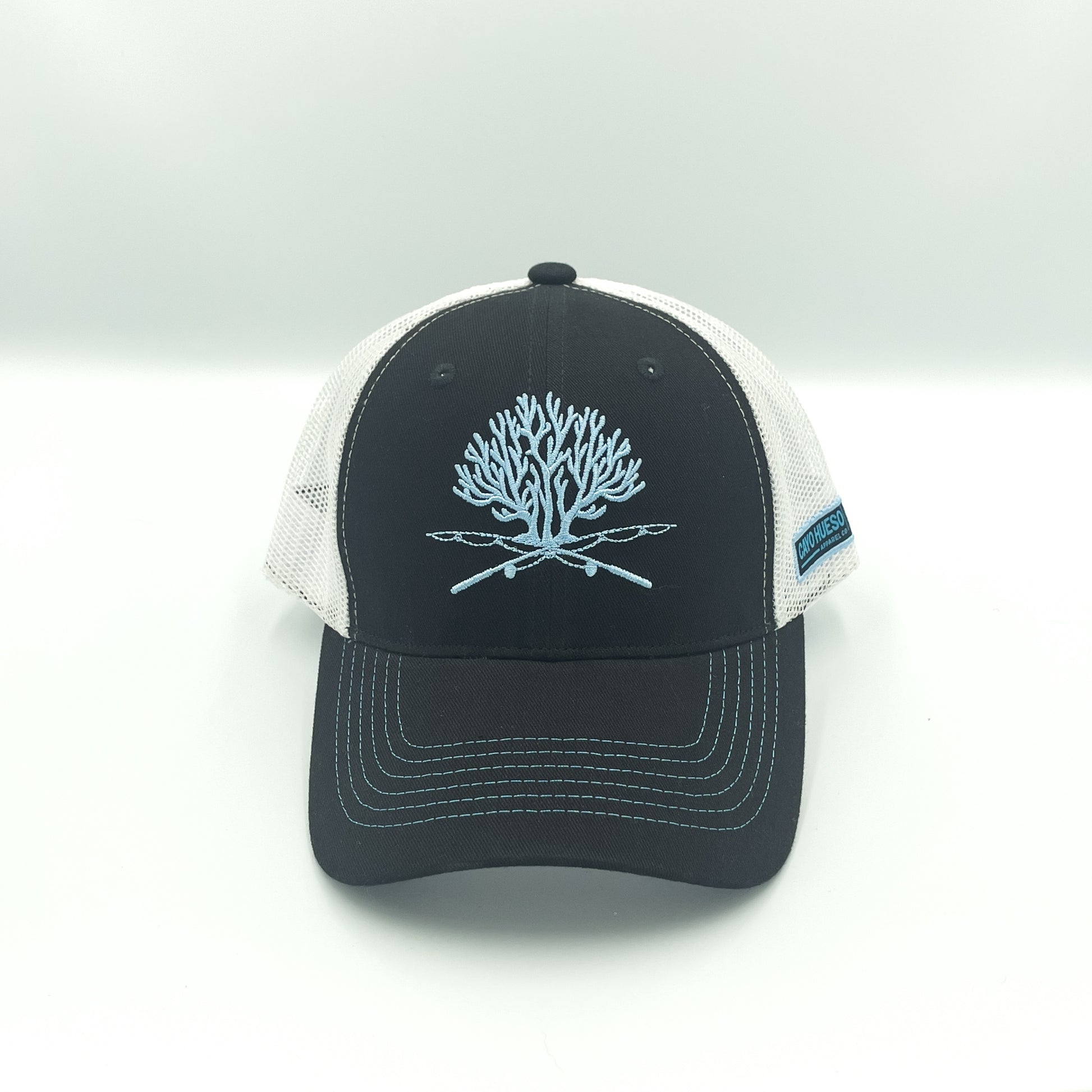 A classic 6 panel trucker hat featuring our bold coral and crossed fishing rods design in light blue on black, perfect for island days.